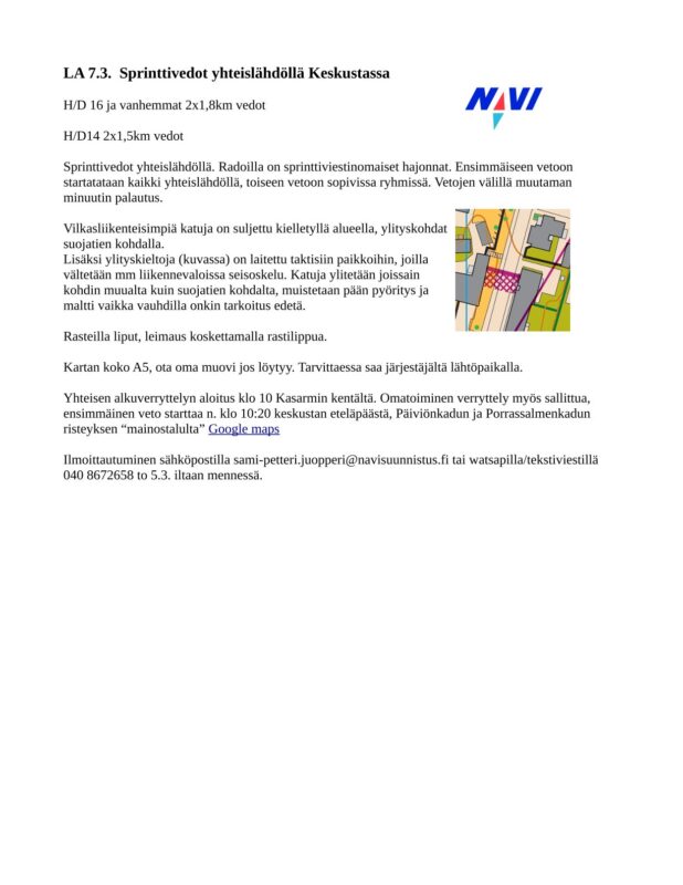 Avoin sprinttiharjoitus Mikkelin keskustassa la 7.3.Tervetuloa sprinttitreeniin! Lue ohjeet ja ilmoittaudu Sami-Petterille torstai-iltaan 5.3. mennessä.Startin sijainti