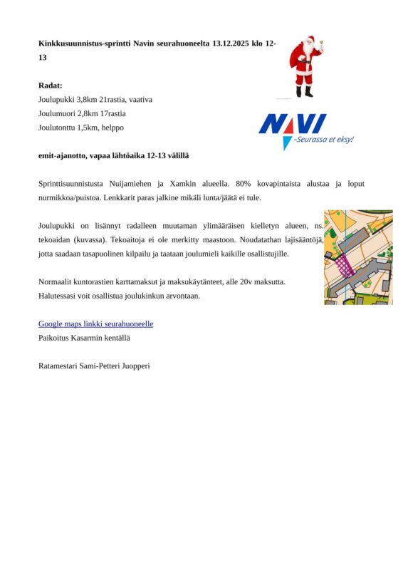 Tervetuloa Kinkkusuunnistukseen ja riisipuurolle Seurahuoneelle lauantaina 13.12. klo 12.00 alkaen! Suunnistusradoille lähdöt klo 12.00-13.00 välisenä aikana. Tapahtuman yhteydessä tasavuosimuistamiset (50-vuotta ja vanhemmat), joulukinkun arvonta (osallistumismaksu oikeuttaa yhteen arpaan) ja saunomismahdollisuus sekä tietysti mukavaa yhteistä ajanviettoa!